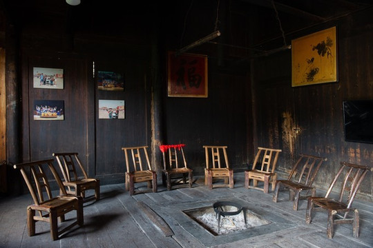 当时进入的农家,椅背缠了红布的就是他当年坐过的椅子,如今还保存得挺完好。