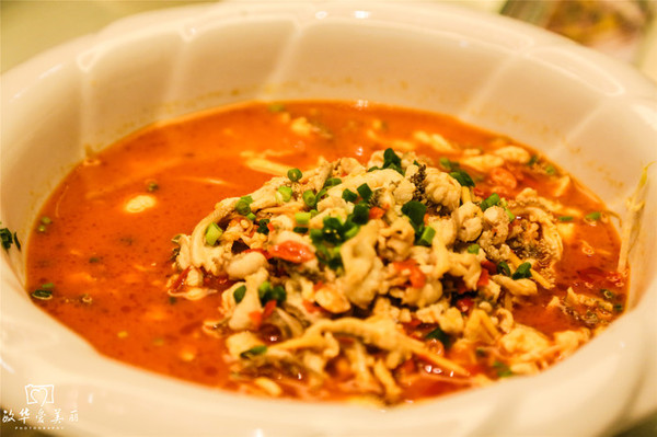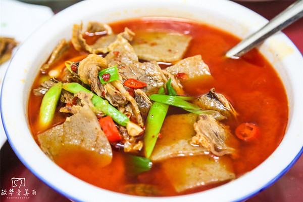 红艳艳一片的汤与四川的毛血旺甚是相似。