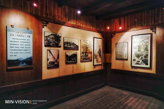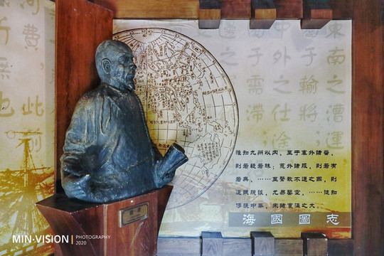一楼陈列室,宣传板上图文并茂的讲述着魏源的经历和毕生著作(著有《圣武记》、《古微堂集》、《元史新编》、《老子本义》、《诗古微》、《春秋繁露注》等书),有一尊魏源的半身塑像,其身后的墙壁上是一幅世界地图,取自他的著作《海国图志》。