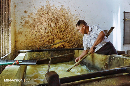 滩头手工抄纸技艺原料取自湖南特有的满山遍野的楠竹,制作工艺要经过20多道,相当繁琐。李志军给我们演示了其中最重要的工序——抄纸,即纸浆变成纸的一个关键步骤。抄纸是用类似筛网的长方形“扛帘”,抄纸工用扛帘往前一推,然后一沉,再往后轻轻提起,扛帘上就均匀的铺满一层薄薄的纸浆,然后从扛帘中揭起就是一张纸,把一张张纸码在容器上,便成了纸胚,再经过晒晾等工序最终成为一张张成品用纸。