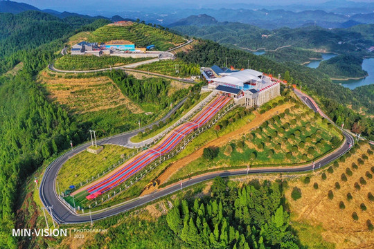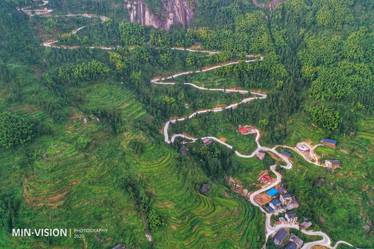 从向家村大门入口到山顶约3公里,充分证明了一条真理:要想富,先修路!一条山路修得如此完美,着实能给开车的司机带来些许的兴奋。路虽然曲折,坡地起伏不定,但双车道会车很安全!人、车道分开,山顶处还有几间小凉亭,遮阳避暑的好地方,坐在凉亭里可以饱览山水风光!