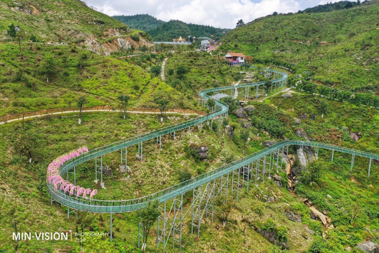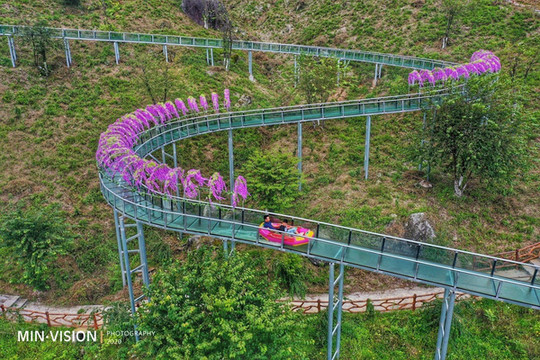走到一半路程,有一处依靠崖壁凸建出来的玻璃平台,迎合网红大咖需求可以有这样一处造景,也是符合当代年轻人口味的,拍摄出来的照片,人物似在群山云雾中漫步一般……往上行建有一处滑道,可以直接到底看瀑布,但左边也保留了一条步道,虽然下山会有些慢,但那些不可错过的风景也都在这条路上。