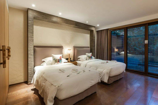 趁着换房的空隙,我们去看了酒店其他的一些客房,也算是给大家的选房tips吧。酒店除别墅外的客房主要有山谷、山镜、山居、空中花园四种,它们都是2018年按照北欧风格建造的,也都在户外泳池附近邻近的区域内,是度假区里规模比较大的一个片区。另外海棠区的客房是分布在不同的别墅中的,百合、玉兰、家庭三居则是独立的别墅。如果常规选择,我个人会比较建议选择山居度假屋。