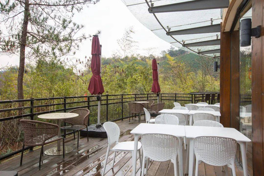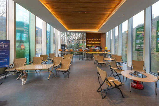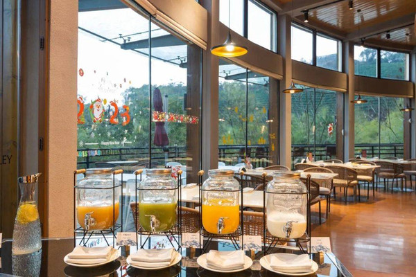 这间餐厅呈C字形,共两层,还设有直面森林的户外用餐区,这个季节略冷,但如果是春秋时节,坐在户外应该非常舒服。二楼临窗的景观位可以远眺到度假区的水库,风景十分宜人。