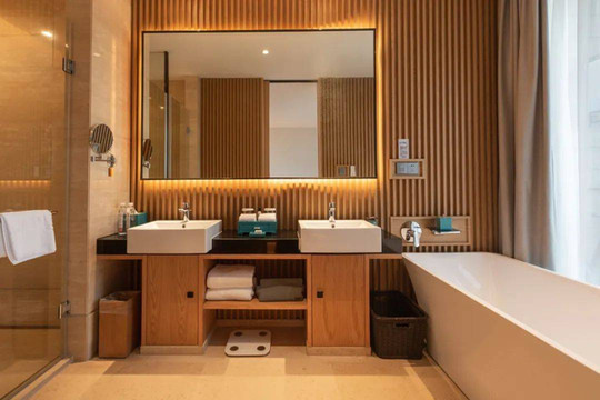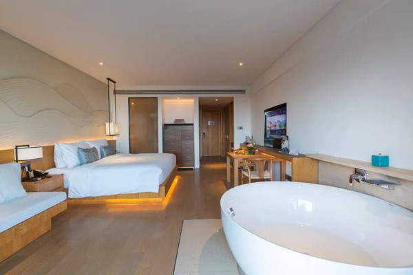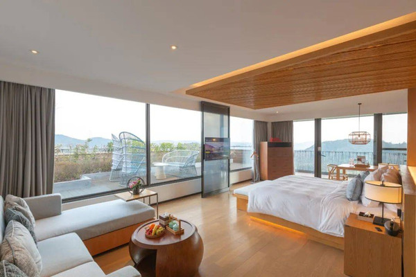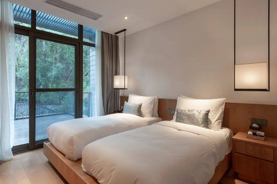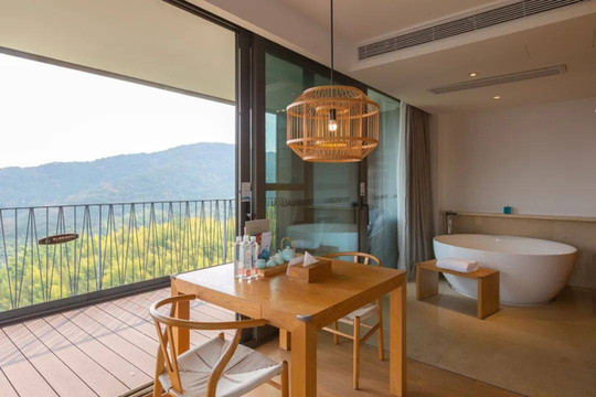 山字开头的客房风格都是相同的,差别在于房间面积、窗外景观。山居度假屋最大的亮点就在于配置了浴缸,而且大床房的浴缸是在窗边的,风景极佳,又十分浪漫,妥妥的网红房型啊!
