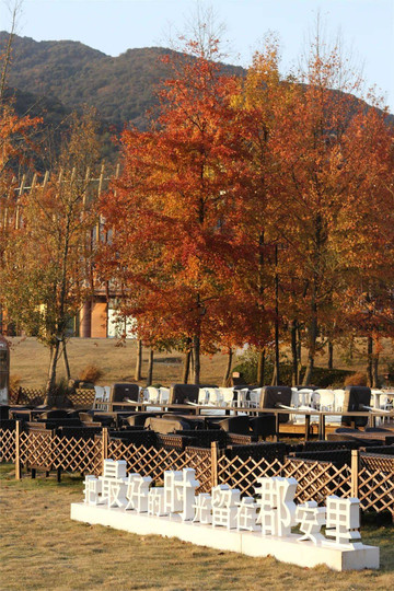 还没从卡丁车的兴奋感里走出来,我已经完全被眼前大草坪的夕阳美景所折服。这里是度假区里最平坦开阔的一块地,周围山峦起伏,叶已泛红,已是山中最好的时光。
