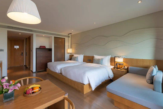 双床房的格局会略有些不同,考虑到客人属性,浴缸也传统地放置在了浴室里。我很喜欢双床房类似双榻榻米的设计,而且所有房间都有一个摆放着休闲沙发的景观阳台,度假感十足。