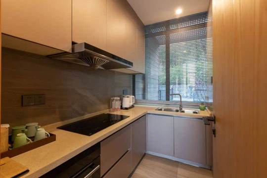 今天我们要换一间更大的房,也是目前整个郡安里度假区内最好的家庭三居独栋别墅。它们是2018年二期工程时建造的,采用的也是更符合新世代人类审美的北欧风格。别墅采用两层设计,一层是超大的平层客厅及一间双床的客卧,配设有洗手间和全功能厨房。