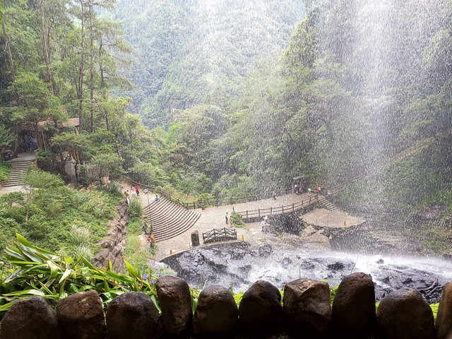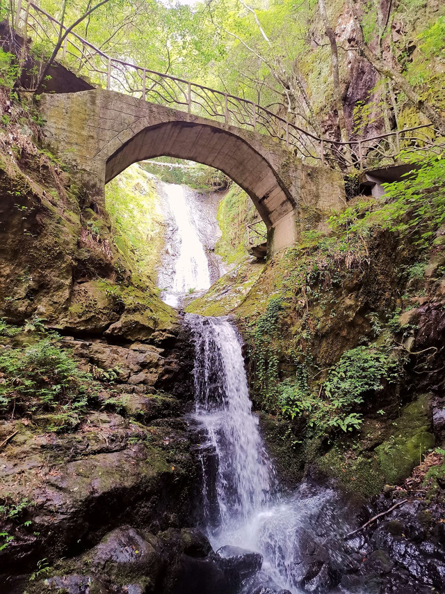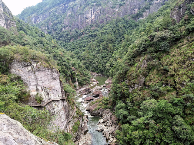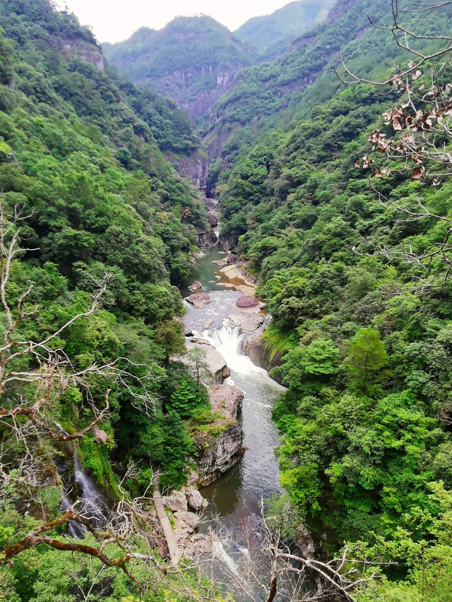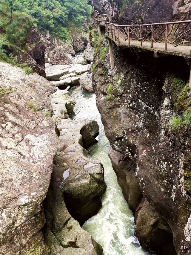刚进入景区,还有些游客,走不久路开始往山底的溪谷去了,下到谷底就只剩我们这对老鸳鸯了,估计是旅游团的客人时间受限,只能走一小段就得回去了。沿着溪水一直走到仙人桥才开始往上走,走到百丈漈游览了水帘洞后买票乘坐百丈漈的垂直电梯上回到山顶,这一下一上耗去了整个上午。出了鸳鸯溪景区驱车前往白水洋景区,原想在路上吃午饭的,可能是疫情客人少的原因,路上的饭店全都没开。最后只好在白水洋景区门口的店里买了两桶速食面做午餐。