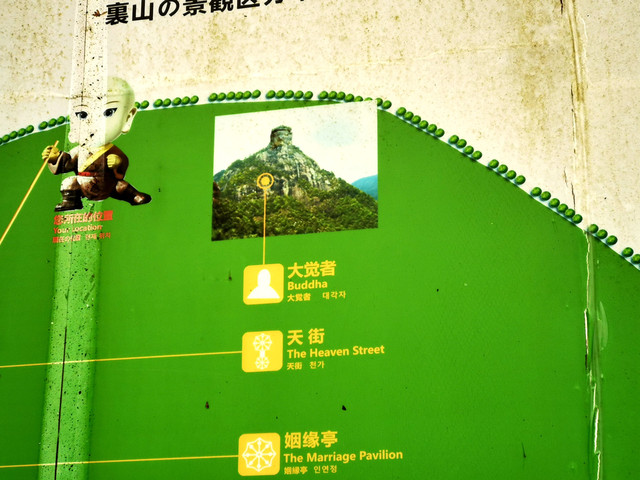八点钟就进景区了,买票时稀里糊涂被忽悠多买了两个本无需去的另收门票的小景点的票(一个灯光镜子,一个“冰雪世界”),多花了二十多分钟。坐观光车到“大觉山镇”(一个完全新造的,主要作为客栈的小“镇”),步行穿过小·“镇”后再换乘观光车直到索道站。索道上到山上后还要爬山,经过“天街”(就三两间小店),一直爬到“大觉者”的位置,发现“大觉者”还只是一座山,大觉者的头都还没有开始建,山上的所有景点都是新建的,索道上站对面有个刚用水泥浇筑的“还没有撕开面纱的神女”头。我都不明白了,景区都没建好,怎么就混了个5A景区?
