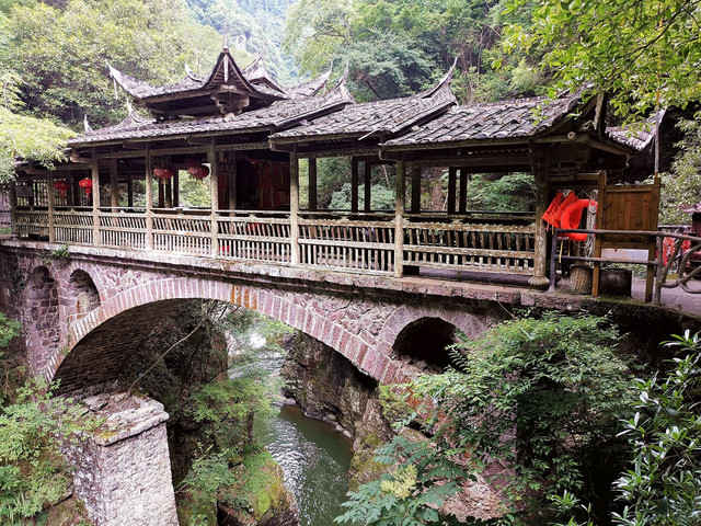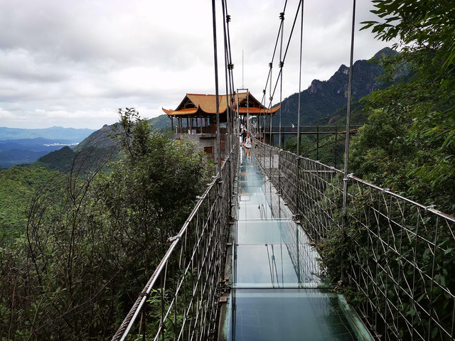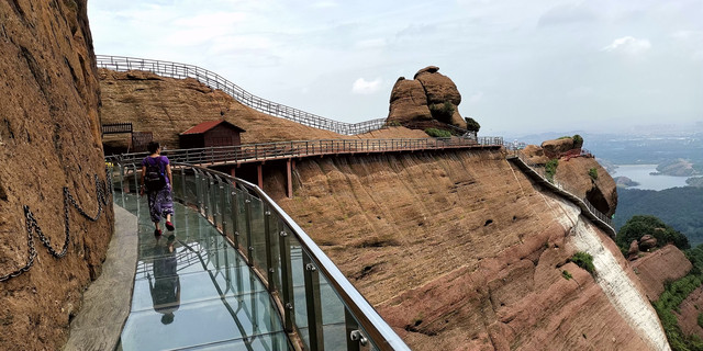 乘观光车进入景区,到一个隧道口下车步行,经过一个不大的湖然后上山。一路上风光迤逦,各种奇形怪状的巨石让人目不暇接。上到山顶,买了40元/人的玻璃滑道票从山上滑下来。软鞋底和玻璃一接触就刹车,要费好多腹肌的力量把双脚抬起才能往下滑。下了山又下起了大雨,可能是景区因为疫情封闭多时了,路上都长了青苔,脚下一滑狠狠地摔了一跤,幸亏我背了个背包,否则即使这把老骨头不散架,至少也整个脑震荡了。走到游船码头,雨也已经停了,坐船游了清水湖之后从另一个码头上岸,走回大门。
