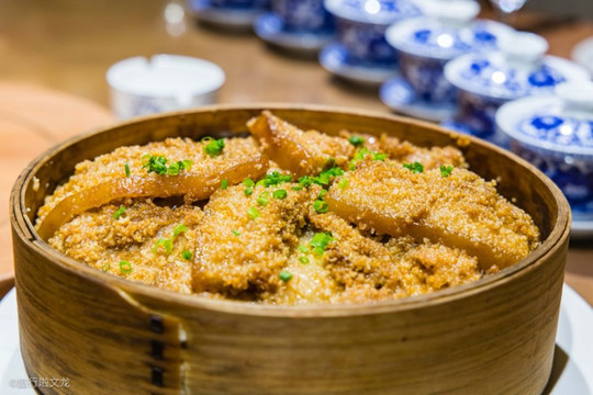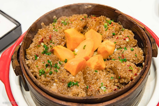 蒸肉地瓜,肉吃起来不像油炸那样松脆,也不像煮一样的嫩,反倒是介于两者之间。