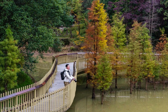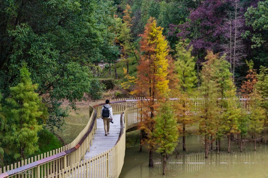 磨盘山森林公园还是全省首座的AI公园,上面的智能步道就是植入了智能化的元素。这里拥有着十二个大的节点。还有个智能语音亭,与诗词亭语音对话, 喊一声“小度小度”,它就会智能的和你交流,什么问天气,放歌曲,查历史等等。步道也是有在湖水上存在,在这样一个特殊的地方忍不住记录下来。磨盘山森林公园目的是为了打造自然生态与适宜生活相结合的一个供大家所行走的步道,置身于森林中能感到心情愉悦。