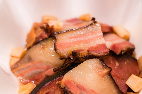 这里的水煮肉片分量很足,别看汤很油腻,吃起来却是恰恰相反的,有着咸浓微辣。腊肉与烤鸭是相匹配的,全是肥肉的腊肉,吃起来很Q弹,蘸上灵魂的调制过的辣椒,更是堪称完美。