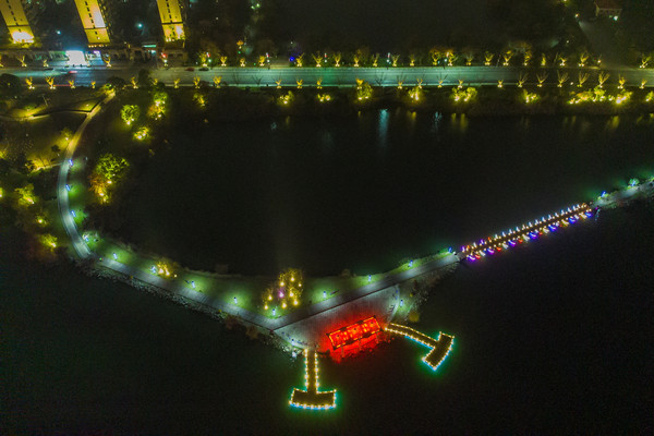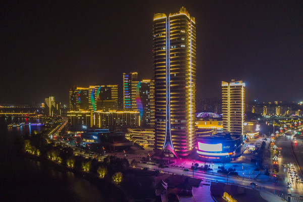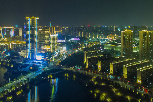 八里湖新区夜景悉心塑造了文博园、兴城广场、体育中心、八里湖大桥、蔡家湖公园、海韵沙滩、八里湖大桥等多个重点亮化区域。