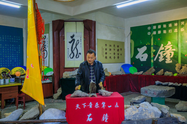 石钟山景区响石艺术馆里传来一阵阵清脆悦耳的歌声。为歌声伴奏的音乐,居然是用小槌敲击石头发出的。用石头“演奏”的老人叫杨赤宇,今年80岁,是石钟山响石艺术馆的馆长。馆里展示着形态各异、音质不同的各种响石百余种。