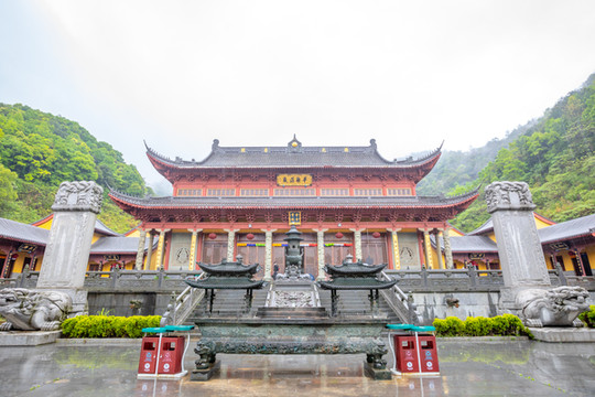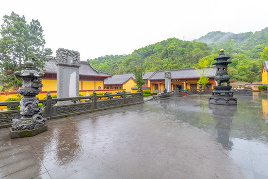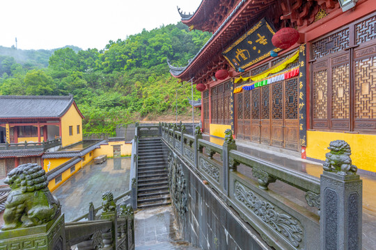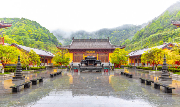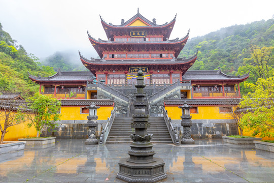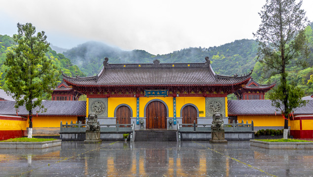 广场上矗立着两根幡幢,雕工精美,寓意深刻。在中国的佛教古寺中,有这样一个身影绝对不会缺席,那就是“天王殿”,在圣集寺也不例外,只不过在这里换了个名字,被称作“如是我闻”,寓意为用心去体会佛法的奥妙,让人倍感佛法的博大精深。古铜色的木门与孔雀蓝的牌匾相互映衬,加以明亮的底色,让人倍感艺术熏陶,此时雨又开始淅淅沥沥的下起来,仿佛间看到檐角处烟雾缭绕,宛若人间仙境。