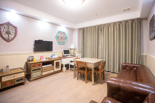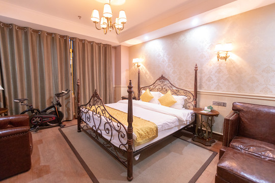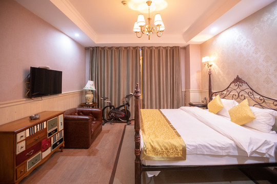 步入房间,浓郁的古典风扑面而来,精致的复古吊灯搭配欧式复古大床,金属感相互碰撞,棕黄色的皮革沙发质感十足,淡雅而不失美感的壁纸尽显温柔,暖黄色的灯光散落一地,窗帘边、台灯下、沙发里,浪漫无处可逃。