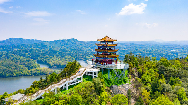 除此之外,龙王岛还设有许多其他景点,如凝秀亭,一座六角形宝葫芦石亭,精致小巧,“山色浮波怡目,湖光藏幽空心”,一语成谶,将仙女湖的美情美景娓娓道来。沿着登山游步道缓缓而上,感受清风徐徐来,此时此刻,我不再是一名用光影捕捉生活的摄影师,而是一位快乐的追风少年。