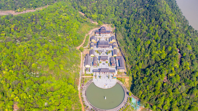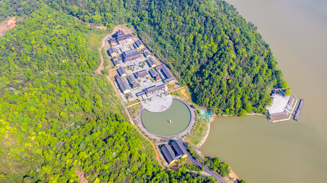 无人机镜头下圣集寺更加恬静,半月形荷花池宛若一块碧玉,依偎在古寺怀中,美的容不得一丝侵犯,独门独栋的建筑错落有致,营造出一副与世无争模样,青砖黄墙外,锁住了多少痴情男女的爱情别离。