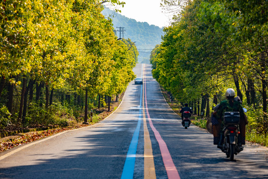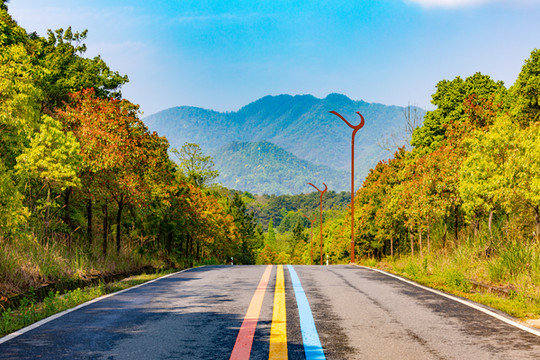 通往仙女湖的,是一条色彩斑斓的公路,将仙女湖紧紧拥入怀中,因此被称作环湖路,沿着道路一路向北,感受车轮顺着红橙黄的彩带不偏不倚,鲜艳的细胞牵动着人们的思绪,仿佛下一站便是童话乐园。
