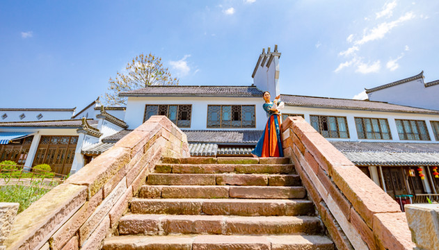 风情园的建筑风格独树一帜,蓝天白云下,一座极具异域风情的门楼遗世而独立,造型迥异,让人仿佛穿越回丽江古城,热情而浓郁的少数民族气息扑面而来,颇有一番韵味。