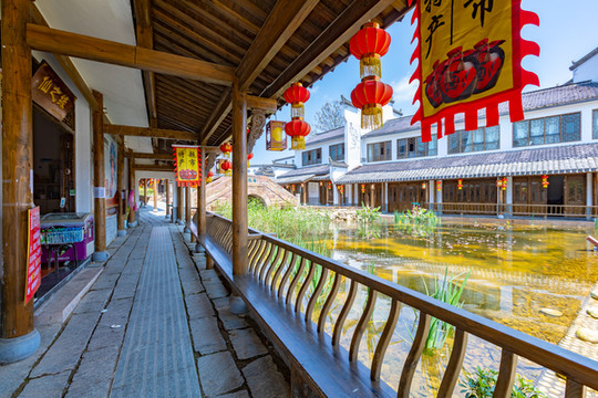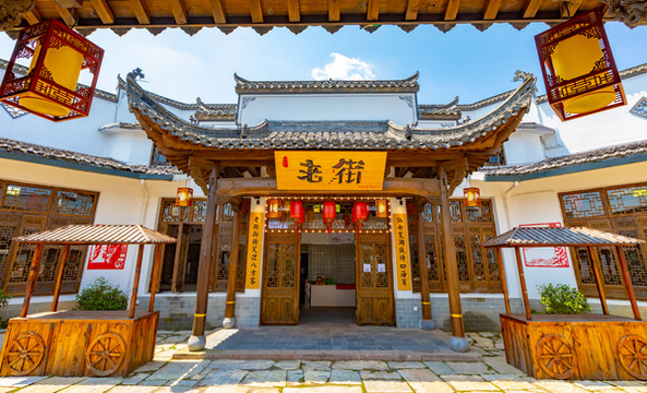 老街中心矗立着一座七仙女雕塑群,七仙女们婀娜多姿,翩翩起舞,眉目间露出动人的神色,栩栩如生,惹得游人纷纷打卡。这里还藏着一座老街客栈,暖黄色的牌匾与棕黄色的木门相互映衬,两侧的灯笼小巧精美,将艺人的匠心精神诠释无疑,客栈门口矗立着两个商铺,虽未见到琳琅满目的商品,倒也能幻想出昔日热闹之景。