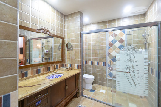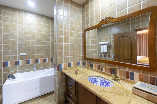 移步来到卫生间,里面的装修更加令人爱不释手,布局采用干湿分离,洁净的浴缸慵懒地躺在角落里,空气中跳动着适宜的温度,最让我心动的,还是那面明亮而精致的镜子,将整个墙面铺满,复古的木质框架尽显古典美,造型独特的金属水龙头搭配青花瓷缸面,低调奢华有内涵,将酒店的气质诠释无遗。