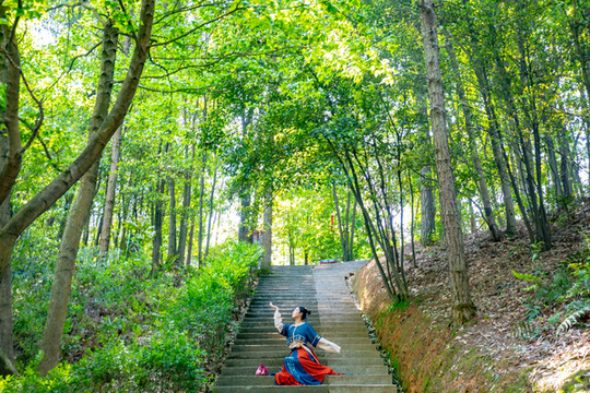 登楼而上,踏着斑驳的石板路前进,感受湿漉漉的气息从脚底弥漫至身体,有些寒气袭来,反倒让人清醒许多,倚楼眺望,可以将仙女湖的美丽恬静尽收眼底。