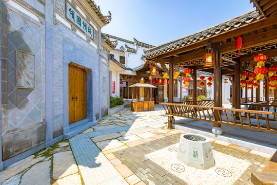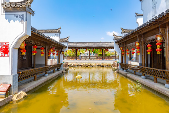 踏着青石板缓缓前行,时光仿佛被按下了暂停键,连空气流动都变得缓慢起来。街道两旁房屋错落有致,白墙黛瓦,马头墙,精致的门窗若隐若现,徽派气息扑面而来。蓝天白云下,一座气势恢宏的建筑格外引人注目,墙面由青砖铺就而成,棕黄色的大门紧闭,被风雨洗礼后的木门更显深邃,两颗古老的铜锁瞬间将人拉回民国时代。门楼处“倾国倾城”四个大字无比醒目,让人不禁想起“北方有佳人,绝世而独立,一顾倾人城,再顾倾人国”,莫非这马头墙内,也藏着一位绝世佳人。