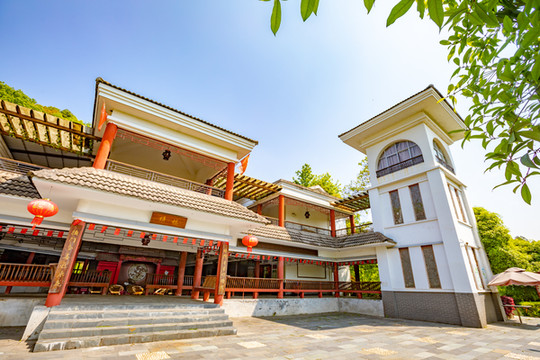 往前走是一座古色古香的绣楼,完全还原了电视剧中的场景,古老的木栏杆搭配大红灯笼,左右对联窃窃私语,相互倾诉着对新人的祝福。大楼内藏有一座婚礼大观园,可以看到各式各样的中西式婚礼场景,由于时间关系,我们并没有作过多逗留。