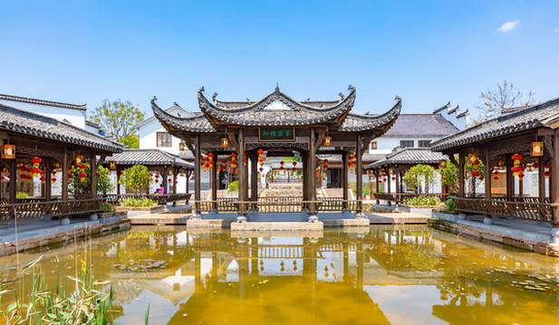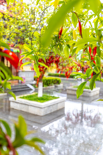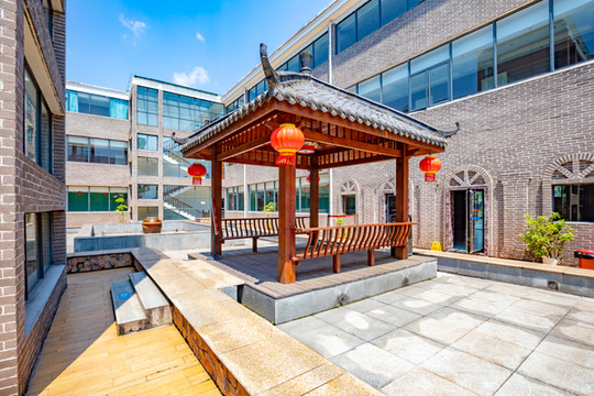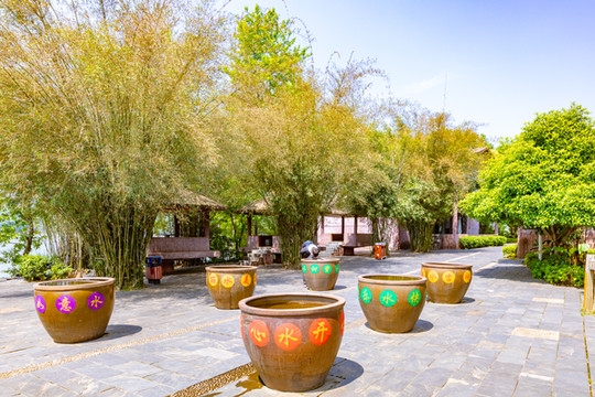 园内绿化十分讲究,高矮不一的灌木错落有致,满眼的绿意让人倍感春光无限。漫步其中,几口偌大的水缸格外夺人眼球,水缸上贴有色彩鲜艳的字贴,定睛一瞧,全都是与水有关的成语,将中国传统文化的博大精深诠释得淋漓尽致。园内的建筑大多以木质结构为主,古朴静雅,倚着栏杆打个盹,缱绻于湖光山色的美梦之中。