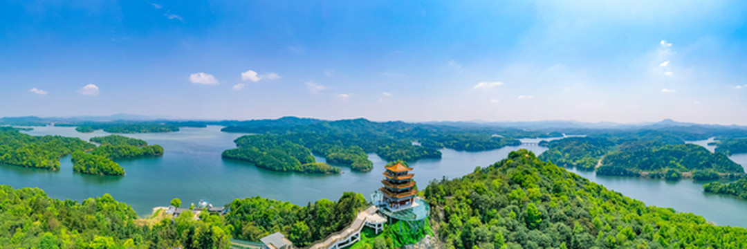 蓝天白云下,一座精致的宝塔赫然而立,一举成为龙王岛的C位,这是一座观光塔,坐落于龙王岛山顶,可谓集万千风光于一身,占尽恩宠。远观宝塔,宛若一座气宇轩昂的宫殿,金碧辉煌,在太阳的照射下尽显威仪,一面临湖,背靠郁郁葱葱的树林,有种苍茫大地、谁主沉浮之势。