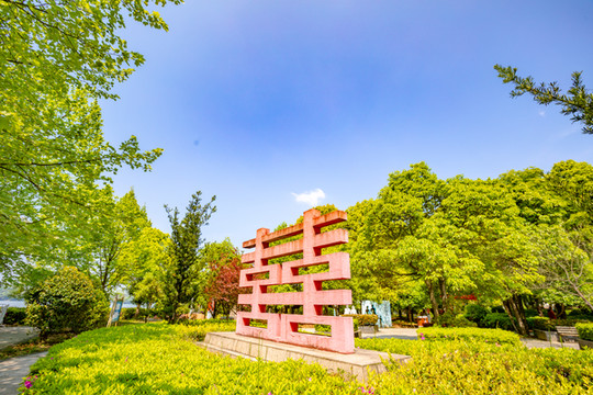 走走停停,一座巨型“囍”字雕塑让我眼前一亮,矗立在青青草地上,为原本单调的草地增添一抹新色。雕塑在风雨的洗礼下,逐渐褪色,尽显历史底蕴,深浅不一的漆面倒使雕塑变得风情万种起来,让人目不转睛,比起鲜艳欲滴的大红色,这种质朴而泛白的红,显得更加喜庆而真实。