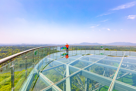 拾级而上,暖白色的台阶与观光塔遥相呼应,两侧是青翠的树林,岁月静好之情油然而生。观光塔的底部是一座圆形玻璃观景台,古朴的塔身与线条感流畅的观景台相互点缀,古老与现代相结合,将艺术美学发挥到极致,凭栏凝目,可以将远山近水一览无遗,天边几朵闲云慵懒的游走,似乎在和游人打招呼,远处山峦叠嶂,倒映在湖面,相互依偎,近处波光粼粼,繁茂的树林肆意生长,就连纹丝不动的建筑都在呼吸,空气中弥漫着数不尽的自由浪漫。