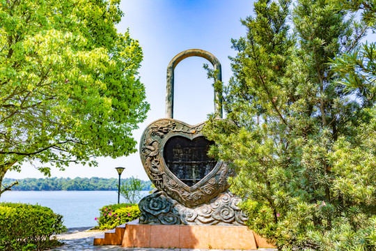 不知不觉来到仙女湖畔,一把沧桑的“同心锁”让人目不转睛,同心锁表面刻有精致的图腾,虽在岁月的沉淀下有些面目全非,细节之处仍旧透露出精致感,它像是一位岁月老人,静静屹立在仙女湖畔,守护这一方土地。