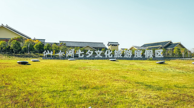 因着仙女湖自带的浪漫传说背景,沿着湖岸这里修建了一大片以七夕文化为背书的,仙女湖七夕文化旅游度假区。