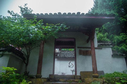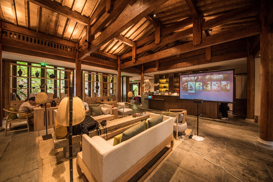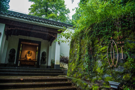 月亮工坊·山院是一座古韵盎然却又不失现代气息的民居,高高的石墙有竹须围挡,步入山院,迎面是一座现代的山门,高屋建瓴,与我们大家传统民宿的小扣柴扉有着极大的认知差异,黑色沉黯,让我们在进入山院前,有片刻的静默和期望,门启,如明亮的光瞬间照亮人们的心智。