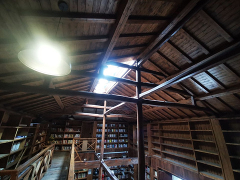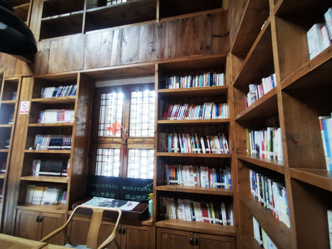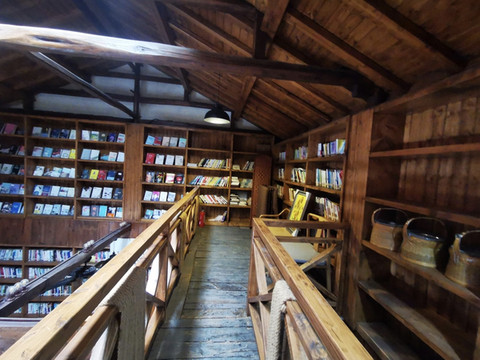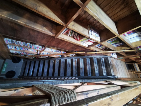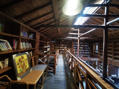传统木制小楼结构,两边都为书架,书架上都放满了书籍,书籍涵盖了范围广,有文学类,美学类,小说类,