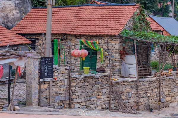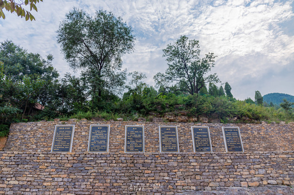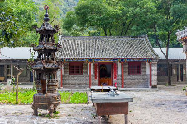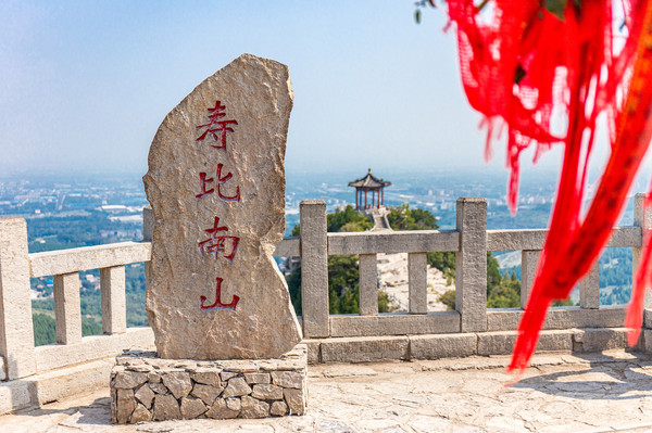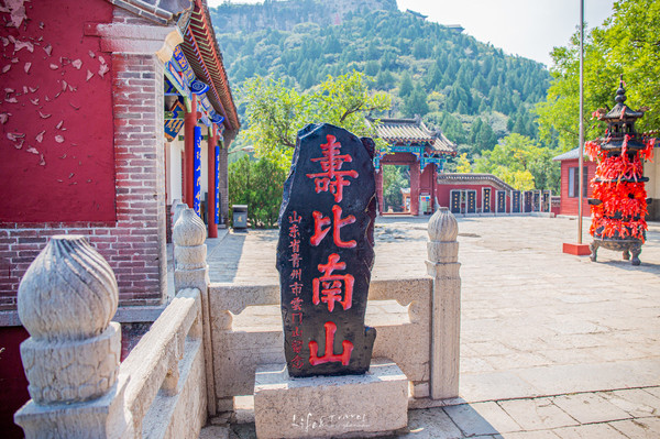 有写着“寿比南山”字眼的石碑立于院中,与山顶的“寿”字遥相呼应。