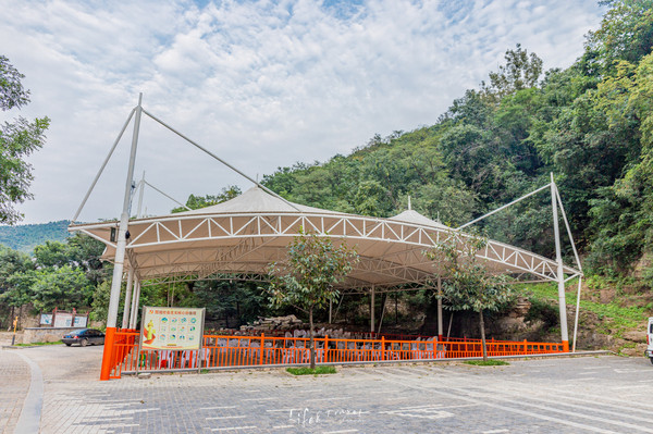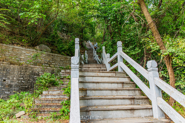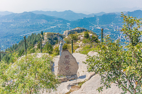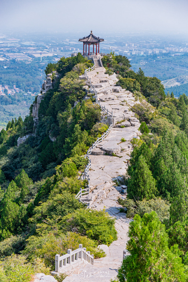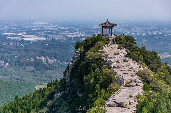 踩着台阶缓缓向上,穿过茂盛的林木,第一个值得停留的地方便是:“观寿亭”,这里也是入景区第一处可以仰观“寿”字的最佳位置,依稀可见山顶石壁上的“寿”字。