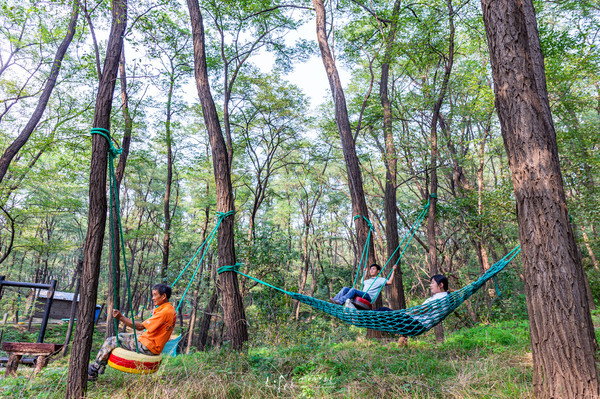 于大片的刺槐林中,一栋栋的树屋散落其中,互不打扰却又环绕其中。在树林中若隐若现,仿佛仙境一般。在这样的树屋里,晒着太阳,喝茶聊天,是别有一番味道的。