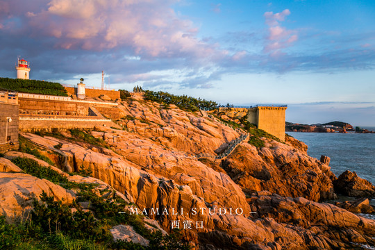 远处的灯塔在蓝天与霞光的映衬下,也显得格外好看。