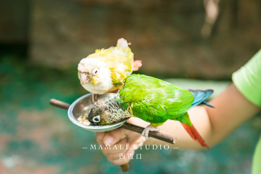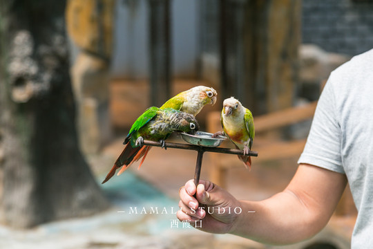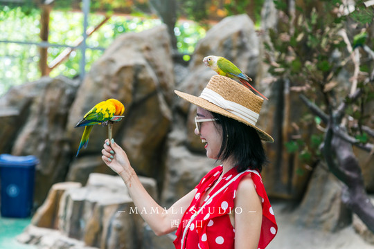 鹦鹉园的小家伙们也是训练有素,上头顶、上胳膊完全没在怕的。跟这些小家伙合个影它们也会很配合哦。