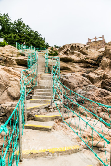 海边栈道虽说看着危险,走起来还是很放心的,加固的缆绳是网状结构的,不随便翻越,肯定很安全。为了方便游人扔垃圾,还有小蓝框固定在上面。