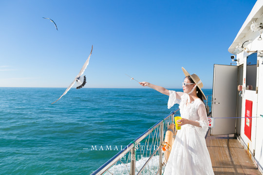 4坐轮渡去海驴岛喂海鸥。海驴岛的海鸥像精灵一般,它们围着轮渡等待投喂。