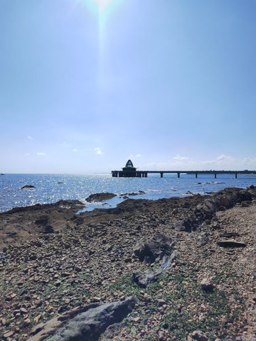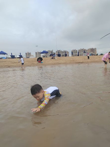 Day 6.上午8点多,小雨一停,我们就来到了一处核酸采样点做核酸。这次是人数最多的一次,大概有不到一百人排队做核酸。做完核酸后,我们搬到了昨晚新订的距离威海国际海水浴场非常近的一处酒店,是我们此行最贵的酒店,房价540元,这个酒店服务不错,免费为我们升级了海景房。酒店停车方便,步行去海边大约10分钟就到了。本来的计划是去刘公岛游览,结果我们到达去刘公岛乘船的码头后,由于核酸时间已过48小时,扫码后显示黄码,无法乘船。去不了刘公岛,就去海边玩吧。这里真要夸一夸威海、荣成的海水浴场,基础服务都是免费,海滩可以随意搭帐篷、游泳、玩耍,甚至冲洗也是免费的。不像有些地方,把海水浴场圈起来收费。威海的国际海水浴场也是我在攻略里找的,海水干净、沙滩细腻,堪比那香海的钻石沙滩。这样好的地方,当然值得我们花费时间流连忘返。恰好当天温度不高,碎云散落在天空中,海水也暖暖的,我们在海水浴场又玩了一下午。与荣成一样,老伴儿在帐篷里休息,我带小朋友下海,小朋友仍然是尽情享受与大海的亲密接触。