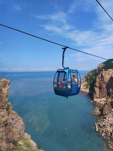 离开鸡鸣岛后,我们驾车约40分钟来到了摩天岭索道。当天游客非常多,景点采取了临时限流措施。我们排队将近一个小时,才坐上了跨海索道。索道平时有三条游览线路供游客选择,但当天由于游客过多,只开放一条单程跨海索道。索道运行路线下边就是悬崖和大海。坐在索道吊篮里小心向下望去,一丝害怕的感觉浮现出来,只好收回目光,尽力控制自己向下看的冲动,努力把目光投向远方美景。一般的索道主要功能是运送,代替人的脚步。而摩天岭索道的功能却是观景,给游客提供一个不一样的观景体验。小朋友虽然是第一次乘坐索道,却丝毫不知道害怕,在吊篮里仍然蹦蹦跳跳,试图打开吊篮的门。实际上吊篮的门在外边已经插死,里面根本打不开。老伴儿本来有些恐高,看到小朋友的操作,脸色发白,厉声喝止,有一阵儿吓得不敢睁眼。下索道后,发誓以后再也不乘索道了。索道单程大约35分钟,下索道后,还需要排队做免费大巴车返回出发地驾车。我们果断地选择了打车回去,节省了不少时间。