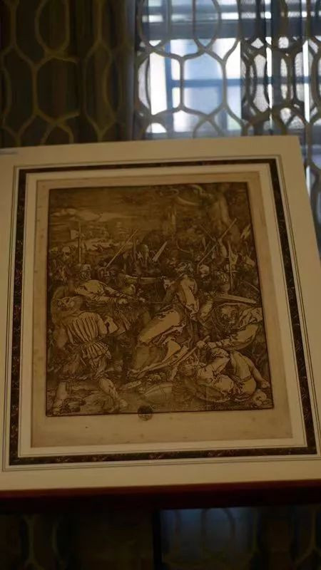 “犹大带着一队士兵,还有祭司长和法利赛人的差役,拿着火把和武器来了。那些人 上前,下手拿住耶稣。” 面容狰狞的罗马士兵用绳索、用棍棒、用手拉扯牵引着耶 稣欲将其带走。此时“西门彼得拔出刀来,将大祭司的仆人马勒古砍了一刀,削掉了 他一个耳朵。耶稣对他说:“收刀入鞘吧, 凡动刀的,必死在刀下。” (引自圣经故事)丟勒完美精准的描绘了耶稣被捕的这一重要时刻,画面构图饱满紧凑,刻法流畅、疏 密有序,人物神情动作各异、主次分明,冲突紧张激烈。