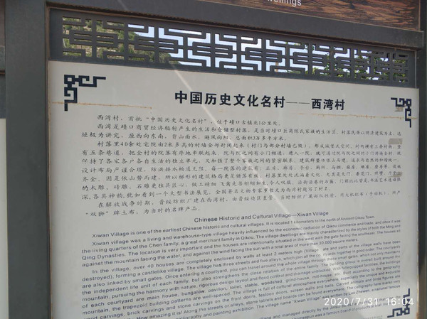 西湾村以独具特色的民居建筑闻名于世,这处完整的居民建筑群,是依靠黄河船运发迹的陈氏家族历经明末到民国300年历史逐步修建而成的,占地三万多平方米,依山面水、背风向阳,随势而上,如波涌浪卷,层次感极强,村内有两横五纵七条小巷均匀地把各处院落串联起来,现保存完好的有四十多处院落,院院相通、户户相连,楼房院墙不拘一格,样式多变,不同地势随行程序、错落有致,与周边环境十分和谐,防盗、防火、排水、泄洪的各种设施配置十分精妙,这里的一砖一石一木都洋溢着浓浓的传统文化气息,各种雕刻构思精巧,刻画细腻。西湾村被评为"全国历史文化名村"。